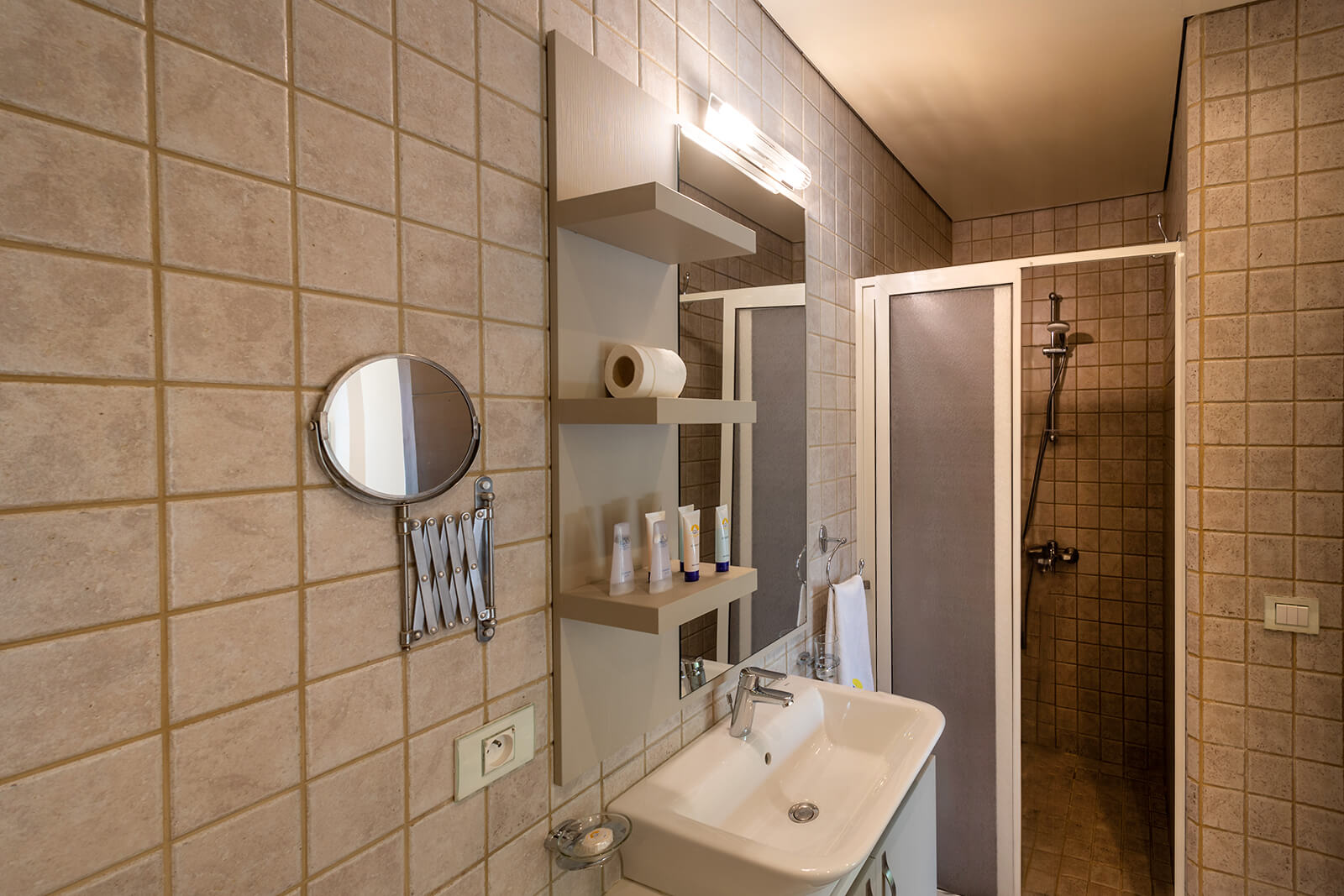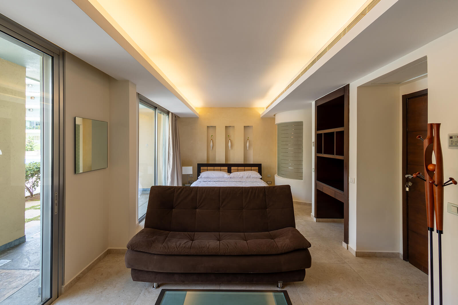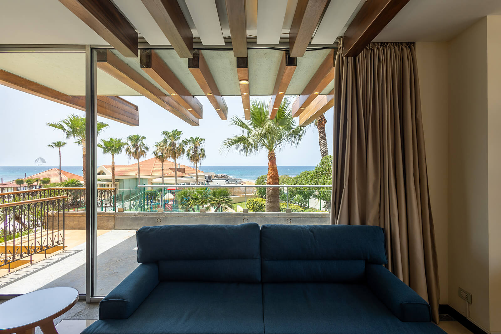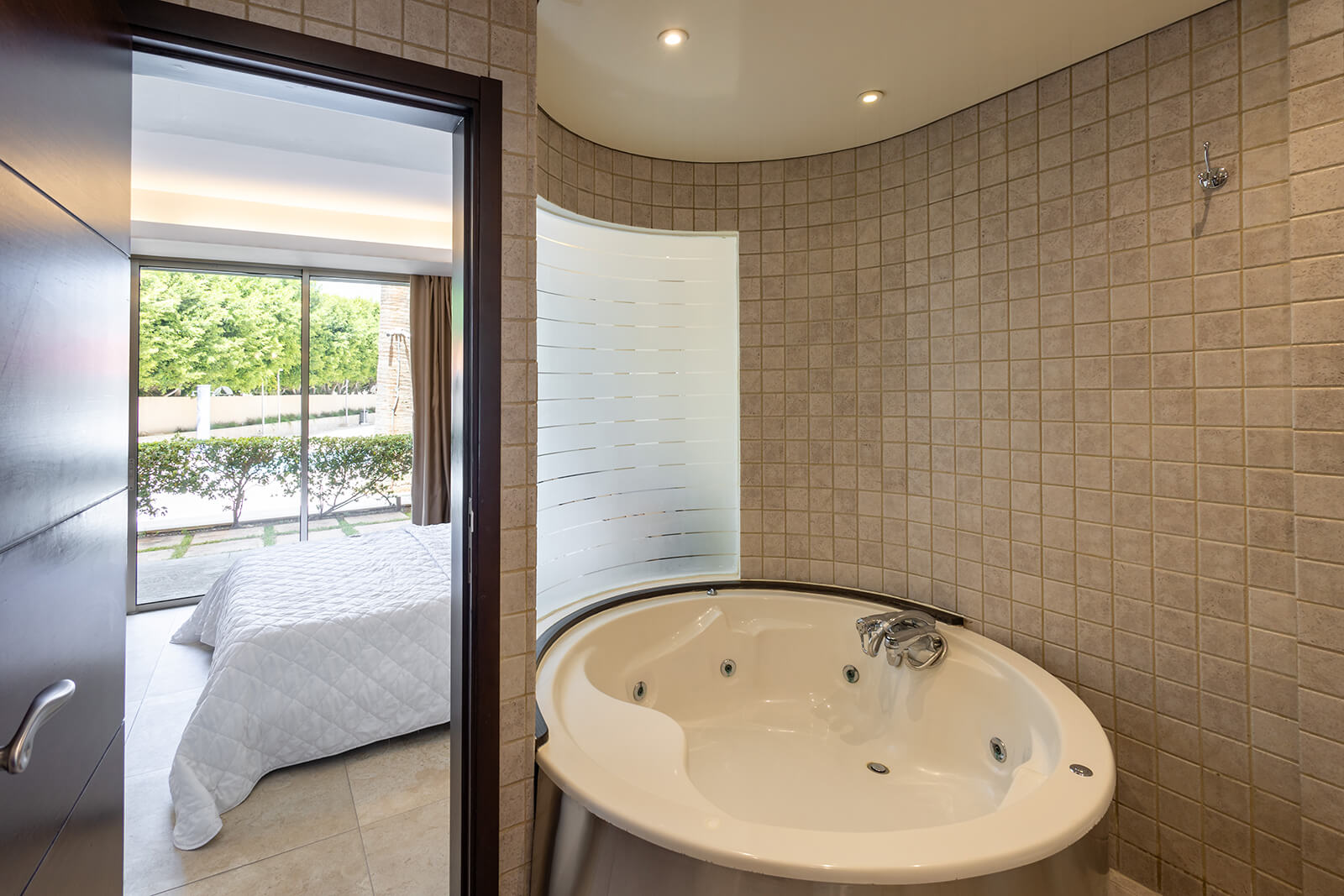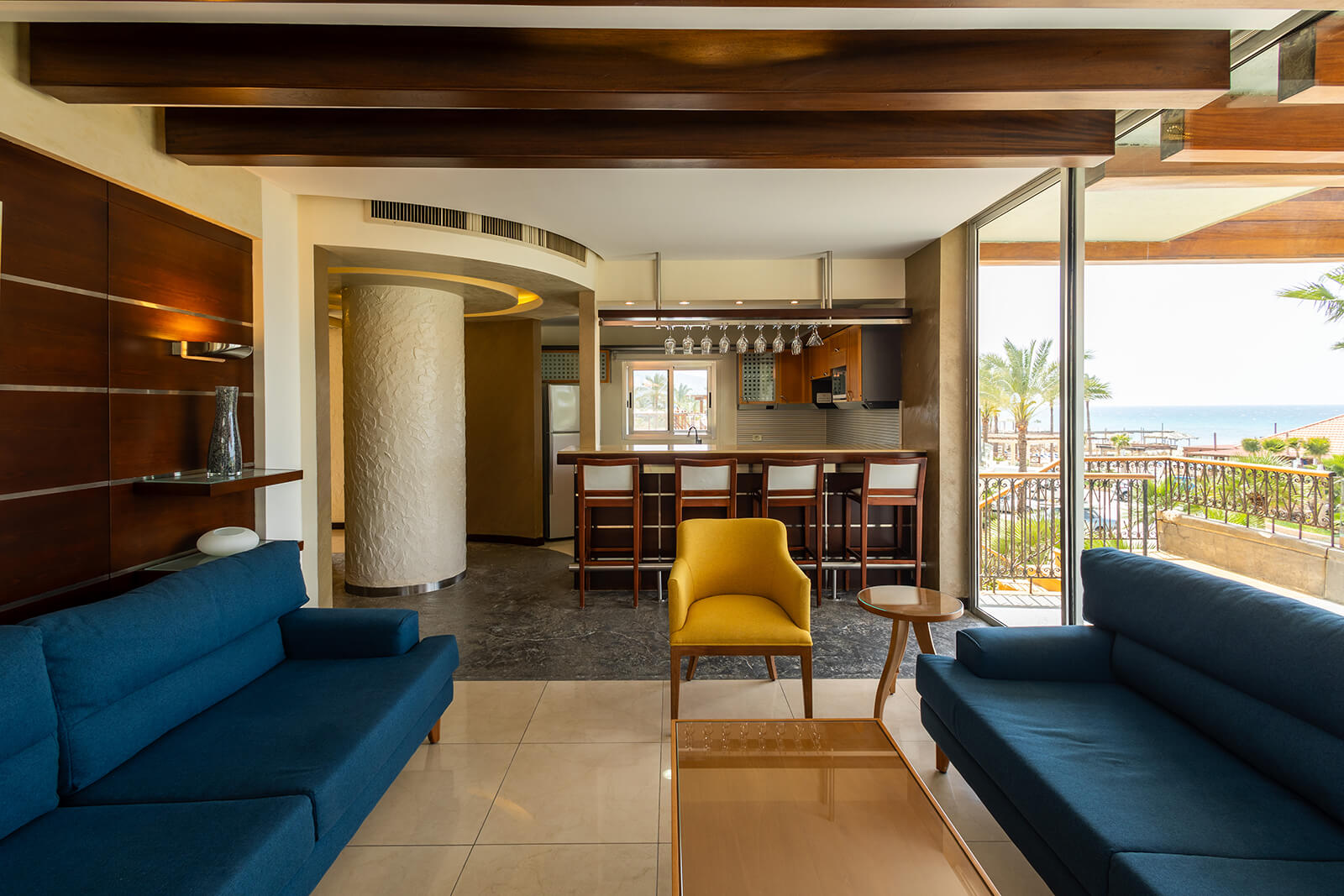 This grand room features a private master bedroom with a king-sized bed and sofa, complemented by a private Jacuzzi in the master bathroom. The spacious living room area includes a kitchenette and an additional guest bathroom. Both the master bedroom and living area offer access to a walkout terrace with views of our Stephano pool and sea.