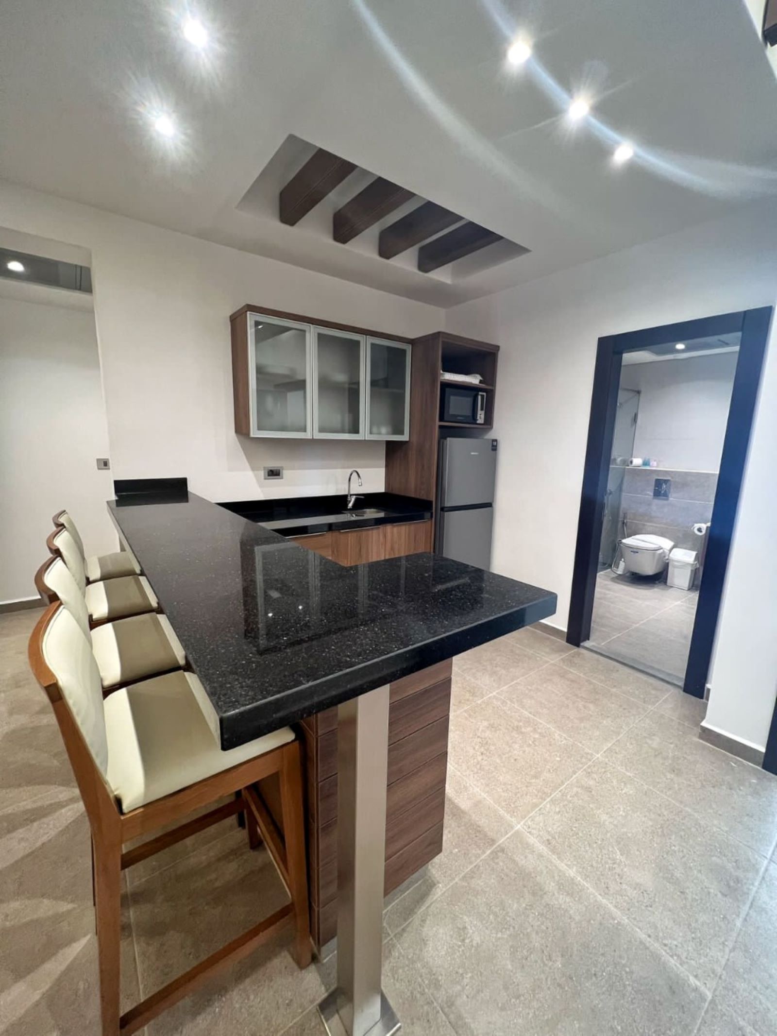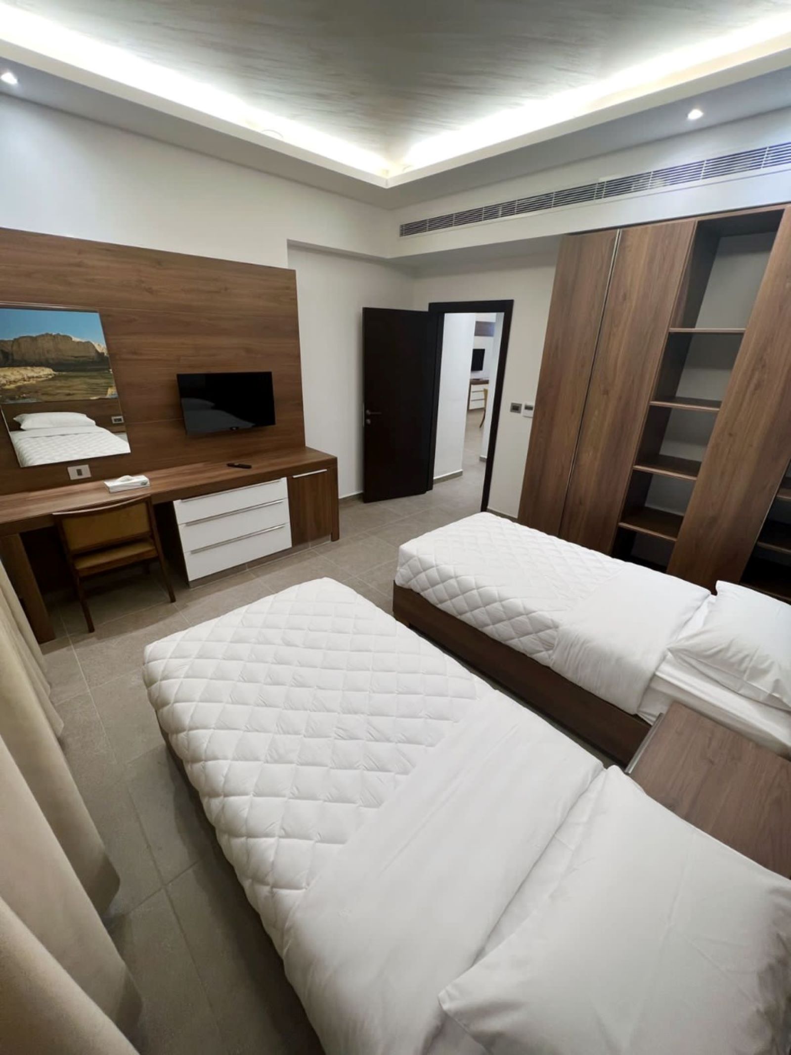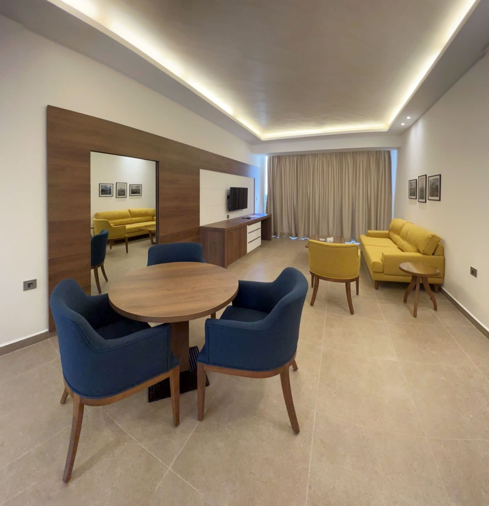 This deluxe room features a master bedroom with a private bathroom and a secondary room with twin beds. The spacious living room includes a second bathroom and a kitchenette, with a walkout terrace overlooking our Sunset pool.