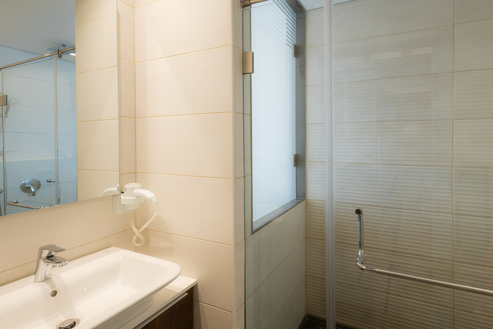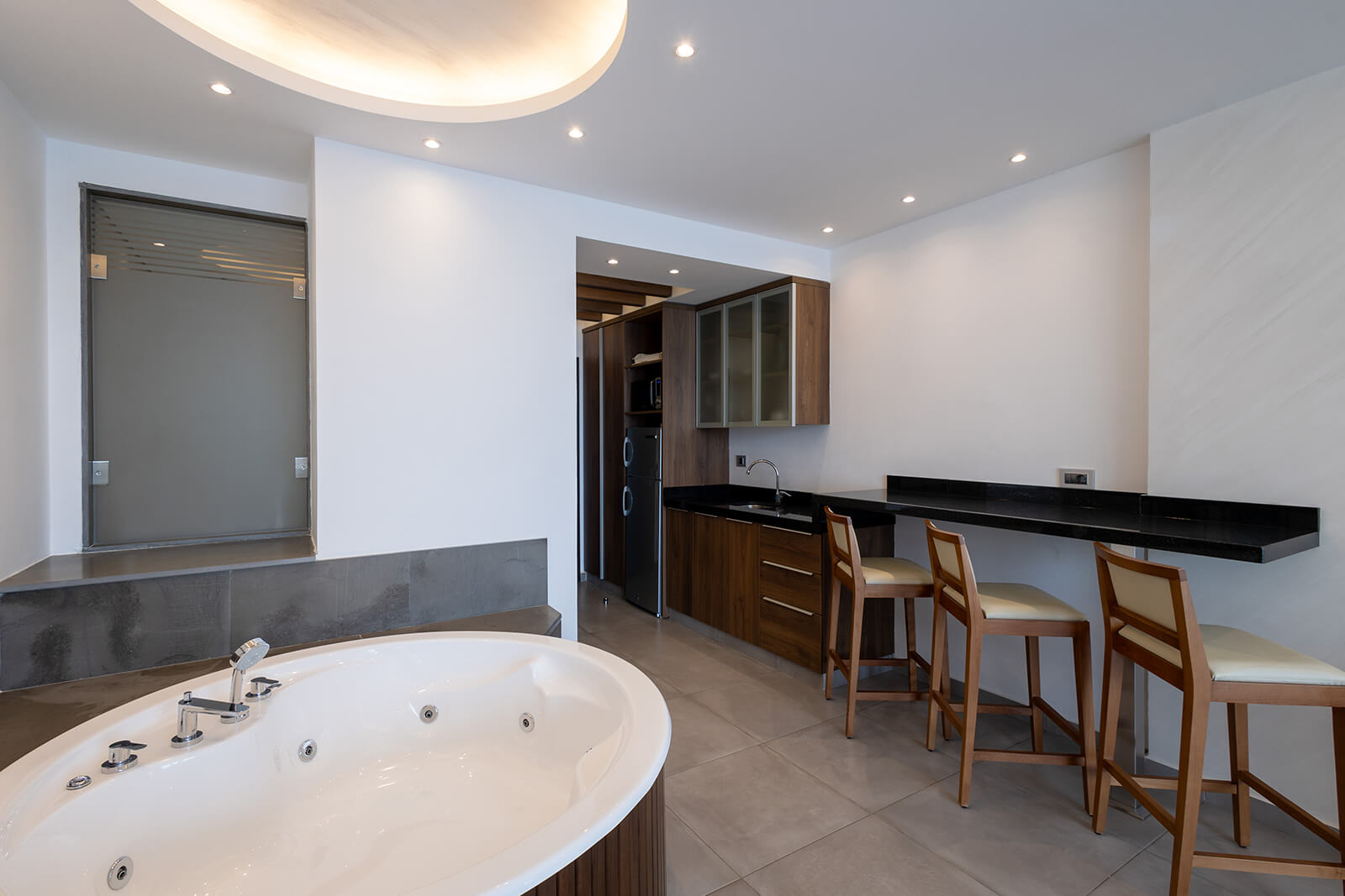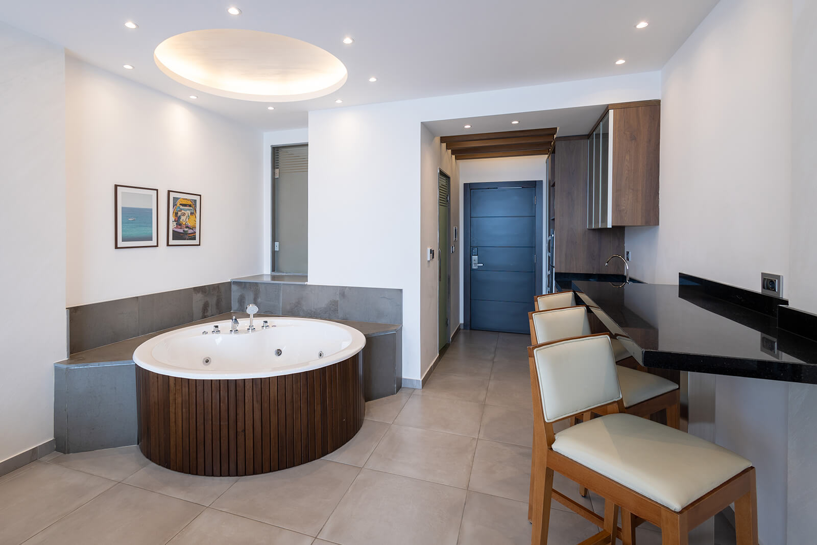 This room features an open space concept with a king-sized bed and a single pullout bed, an in-room Jacuzzi, kitchenette, bathroom, and a balcony with sea view and our Sunset pool.